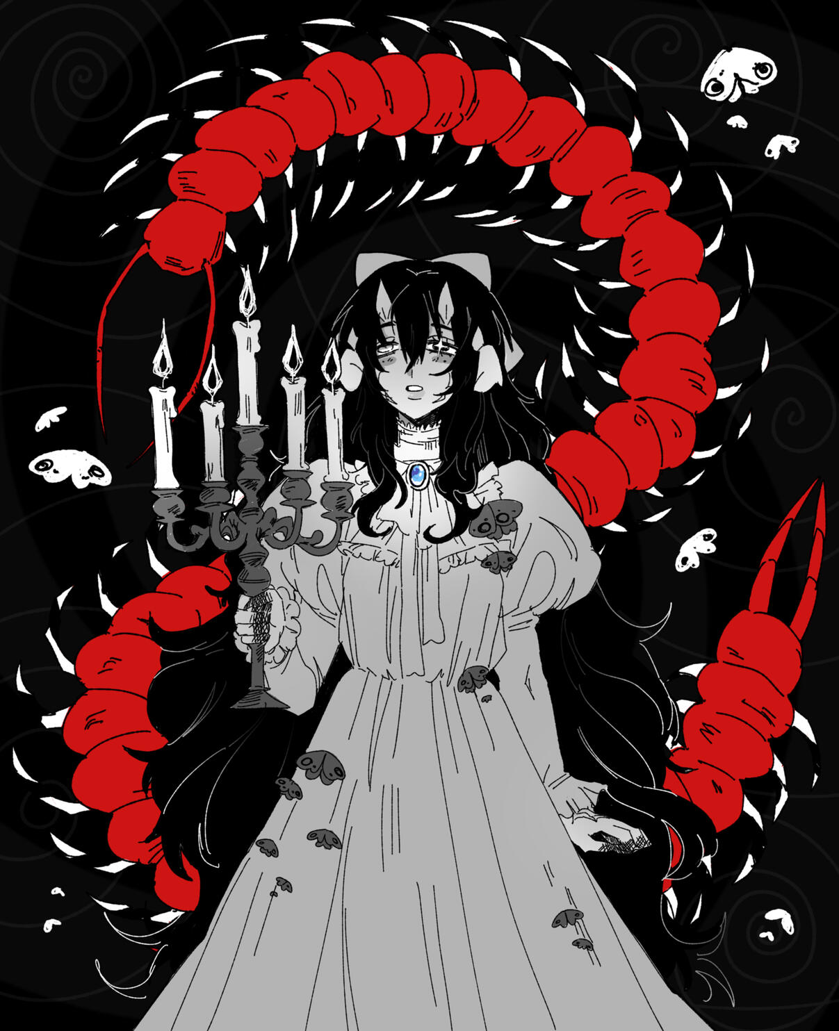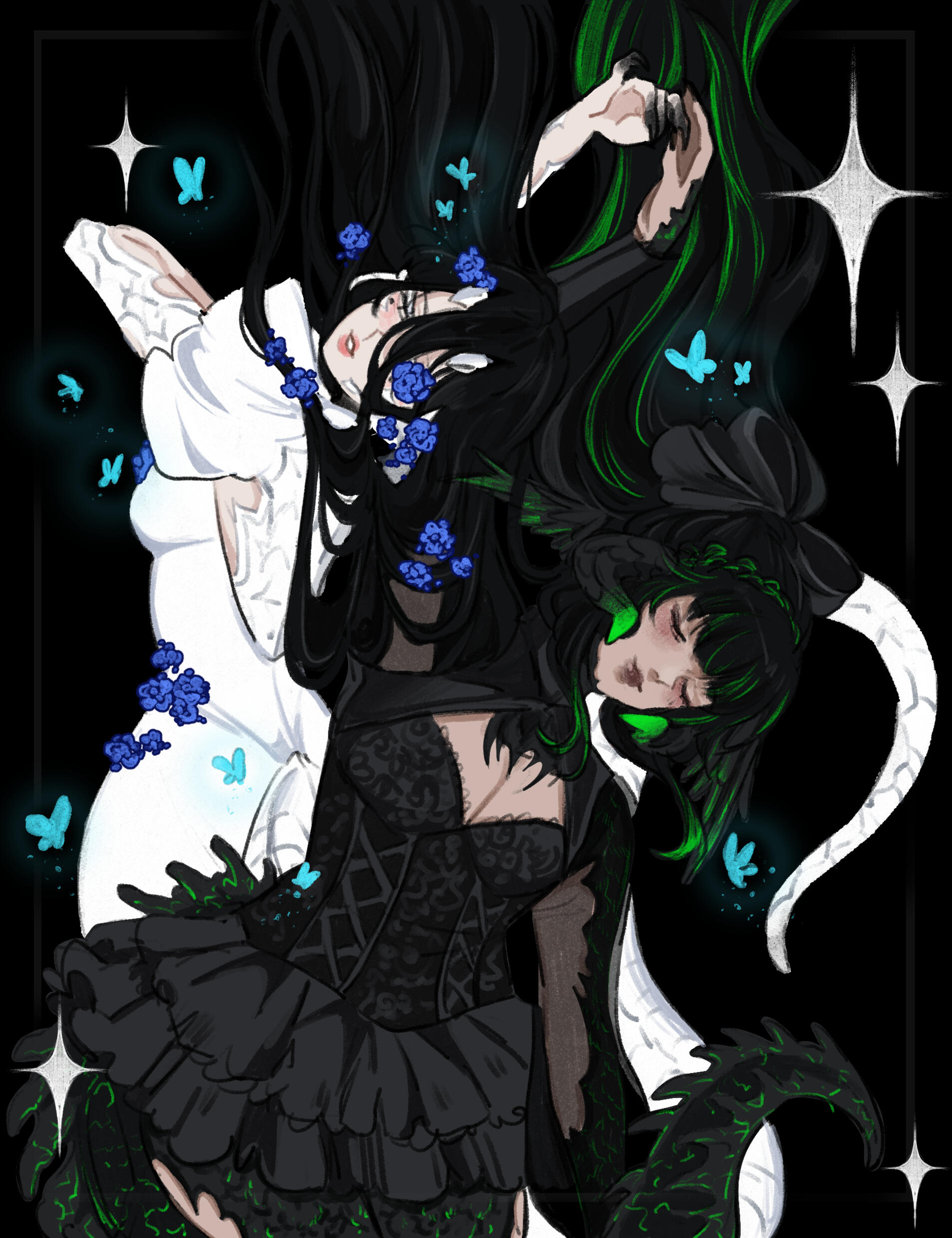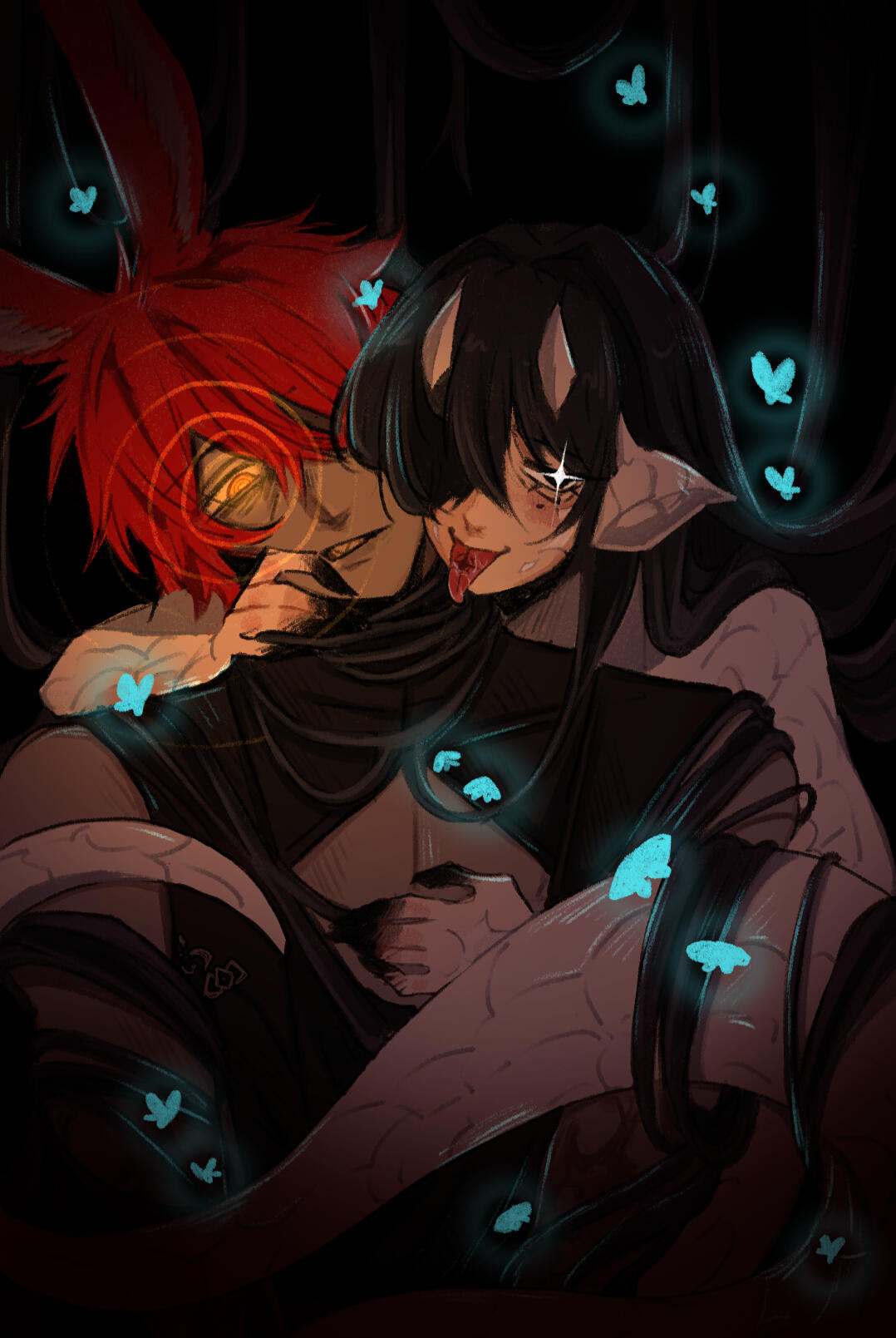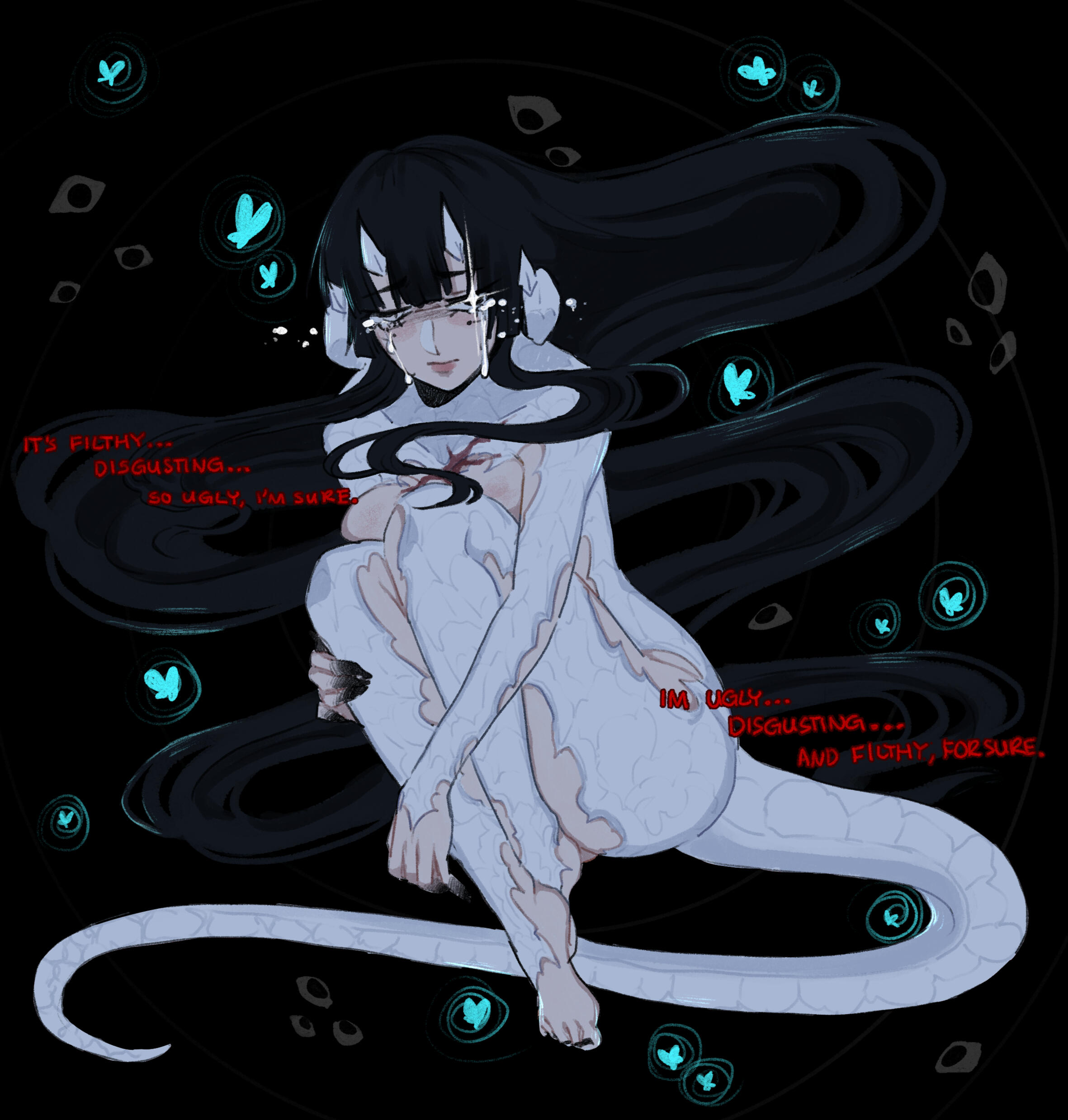 gods, is that what you think it is? why of course! a proper infestation of bugs (moths to be specific), crawling all over her. tons of little bright blues that are all too keen and all too curious.