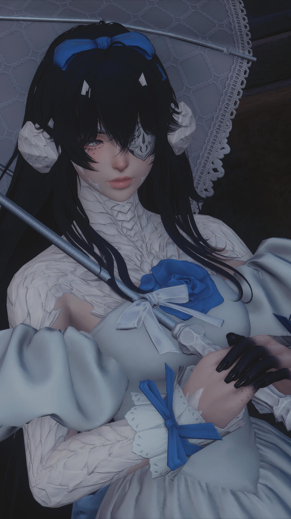 a black lantern is mounted to her back at the end of a long staff. in the presence of all things void and spiritual, it seems to ignite into a brilliant blue flame.